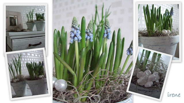 Vi tog en tur min väninna och jag, ut för att leta efter vårblommor i helgen. Det är inte mycket till vår än, så här i slutet av januari när det blåser snålt kring öronen och snön ligger i drivor, men de små lökväxterna ger hopp om bättre tider. Pärlhyacinten är en av mina favoriter. För att få ännu mer vårkänsla piffade jag även med Kalanchoe i den vita baljan och i en romantisk pappersburk. Det blev lite försmak av vår i alla fall, åtminstone inomhus...underbart...